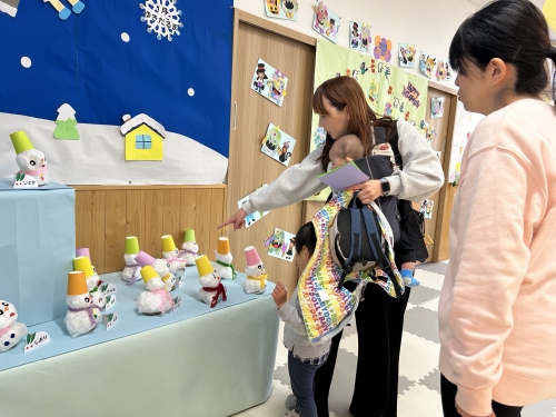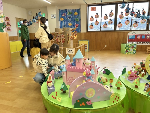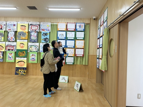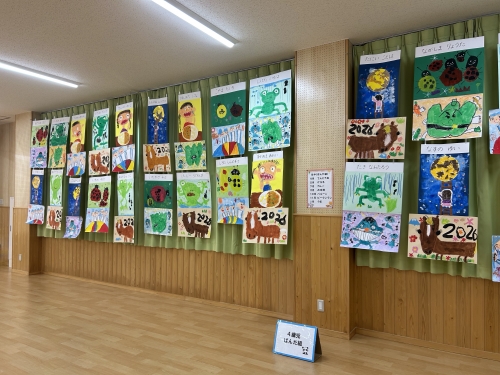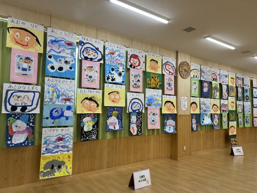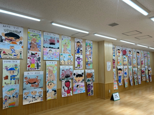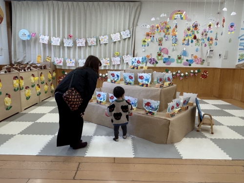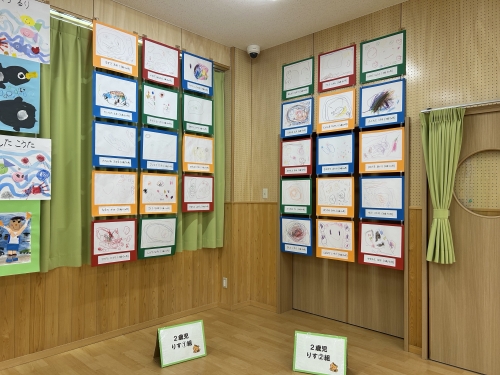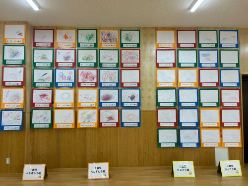 遊戯室には全園児の絵画が飾られました。0、1歳児も今しかないなぐり描きがかわいいですね。