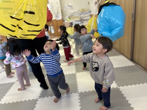 1歳児クラスは鬼風船にボールを当てたり、パンチしたりして楽しんでいました🎵