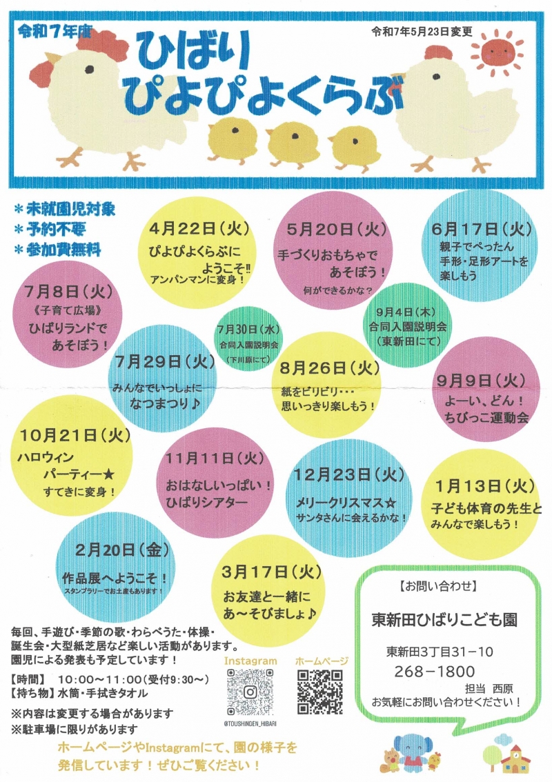 | 持ち物: | 水筒・手拭きタオル(おしぼり) ※おやつのおみやげがあります。 |